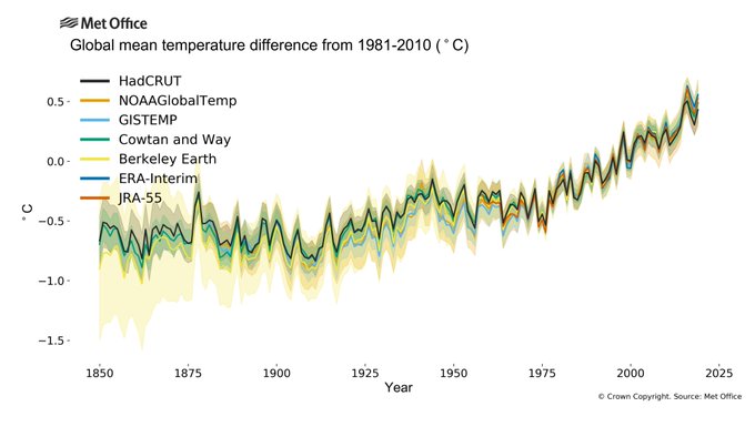 Setting aside Curry's misuse of English, how do her aforementioned listed claims hold up? 2018-not-top-five is false, since 2018 was the fourth warmest year in the instrumental record at the beginning of 2019, as Curry herself later admitted. To assess Curry's other claims, one can use temperature analyses that focus on just instrumental records from thermometers.